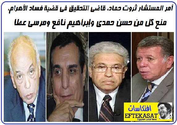 أمر المستشار ثروت حماد، قاضى التحقيق فى قضية فساد الأهرام، منع كل من : حسن حمدى إبراهيم نافع مرسى عطا