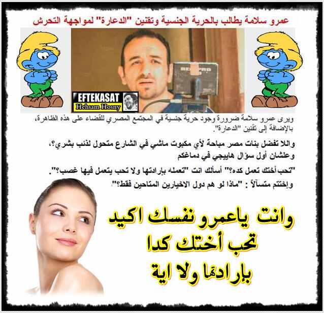 وتابع قائلًا: "اللي بيحبوا بعض وعايزين علاقة جنسية يكون لهم الحق في ممارستها والدعارة تكون مقننة ضمن ضوابط قانونية واللا تفضل بنات مصر مباحة لأي مكبوت ماشي في الشارع متحول لذئب بشري؟، وعلشان أول سؤال هاييجي في دماغكم "تحب أختك تعمل كده؟" أسألك انت "تعمله بإرادتها ولا تحب يتعمل فيها غصب؟".