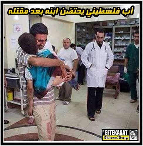 بالصور >>أب فلسطيني يحتضن ابنه بعد مقتله .. غزة تحت القصف الصهيونى !