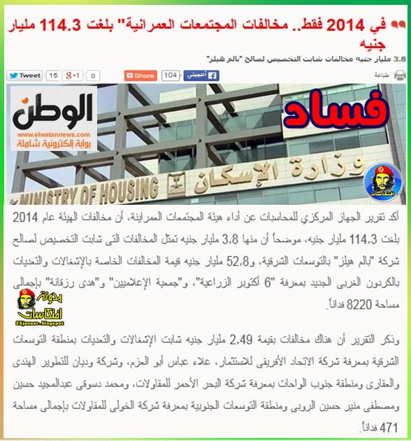 أكد تقرير الجهاز المركزي للمحاسبات عن أداء هيئة المجتمعات العمراينة، أن مخالفات الهيئة عام 2014 بلغت 114٫3 مليار جنيه، موضحاً أن منها 3٫8 مليار جنيه تمثل المخالفات التى شابت التخصيص لصالح شركة "بالم هيلز" بالتوسعات الشرقية، و52٫8 مليار جنيه قيمة المخالفات الخاصة بالإشغالات والتعديات بالكردون الغربى الجديد بمعرفة "6 أكتوبر الزراعية"، و"جمعية الإعلاميين" و"هدى رزقانة" بإجمالى مساحة 8220 فداناً.
