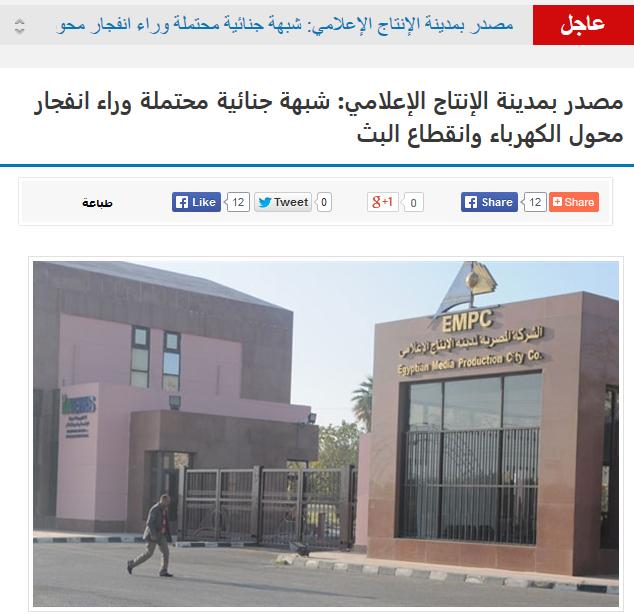 أكد مصدر في مدينة الإنتاج مسئول أنه من المتوقع أن تكون هناك شبهة جنائية وراء الانفجار الذي وقع منذ قليل في المحول الرئيسي للكهرباء المغذي للمدينة، مما تسبب في انقطاع التيار عن المدينة وتوقف بث كافة القنوات .