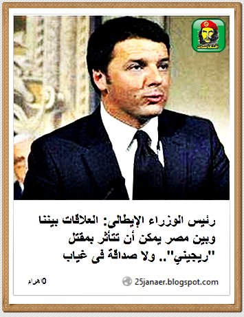 قال رئيس الوزراء الإيطالي ماتيو رينزي إن التحقيق الجاري حول وفاة طالب إيطالي "تحت التعذيب" في القاهرة يمكن أن يؤثر على علاقات الصداقة بين البلدين. وقال رينزي الجمعة لإذاعة راي العامة: "حاليا حصلنا على كل الأجوبة التي طلبناها وطلبنا وضع كافة عناصر التحقيق