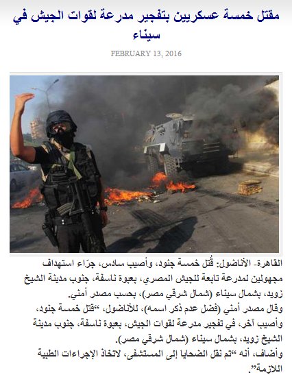 وقال مصدر أمني (فضل عدم ذكر اسمه)، للأناضول، “قتل خمسة جنود، وأصيب آخر، في تفجير مدرعة لقوات الجيش، بعبوة ناسفة، جنوب مدينة الشيخ زويد، بشمال سيناء (شمال شرقي مصر).