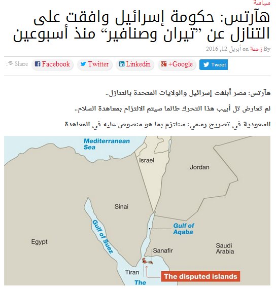 هآرتس: مصر أبلغت إسرائيل والولايات المتحدة بالتنازل..عن تيران وصنافير منذ اسبوعين