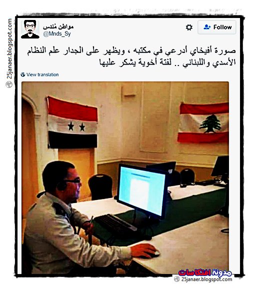 صورة أفيخاي أدرعي في مكتبه ، ويظهر على الجدار علم النظام الأسدي واللبناني .. لفتة أخوية يشكر عليها