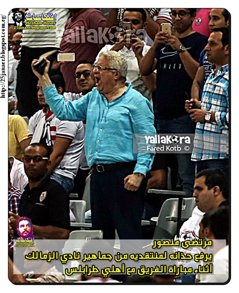 بالصور : مرتضى منصور يرفع حذائه لمنتقديه من جماهير نادي الزمالك أثناء مباراة الفريق مع أهلي طرابلس