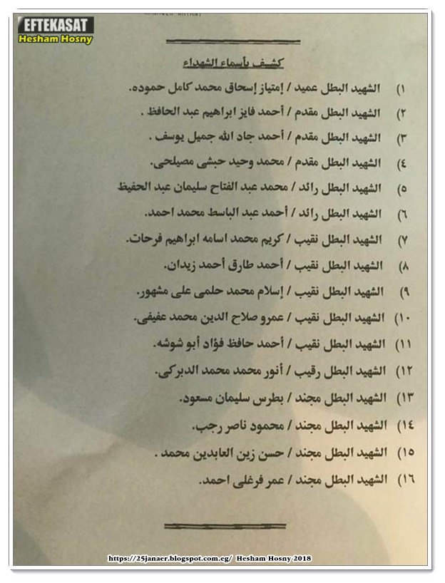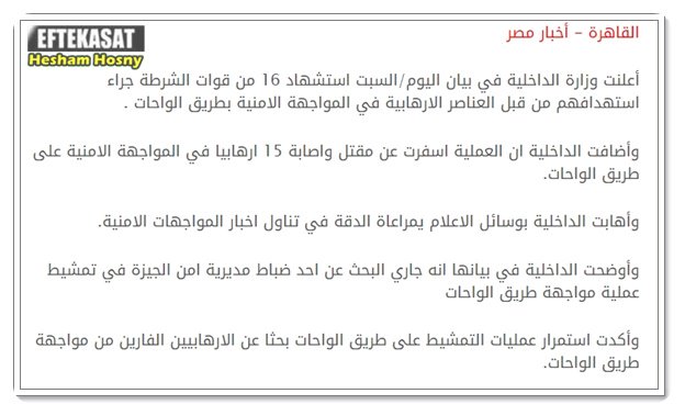 و"تؤكد الوزارة وهي تنعي شهدائها الأبرار الذين ضحوا بأرواحهم فداءاً للوطن ودفاعاً عن المواطنين أن ذلك لن يزيدهم إلا إصراراً وعزيمه على الإستمرار فى بذل المذيد من الجهد لإقتلاع جذور الإرهاب..".