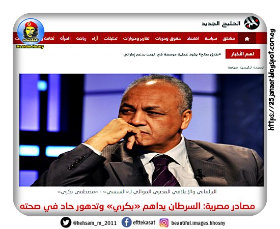 وقالت المصادر التي اشترطت عدم ذكر اسمها، لمراسل «الخليج الجديد» في القاهرة، إن «بكري» المعروف بموالاته للانقلاب العسكري، يتلقى علاجا في عاصمة أوروبية، ويسافر على فترات متقاربة لمتابعة حالته الصحية.
