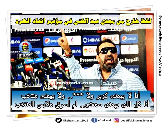 لفظ خارج من مجدى عبد الغنى فى مؤتمر اتحاد الكرة أنا لا يهمنى كوبر ولا ***.. ولا يهمنى منتخب أنا كل اللى يهمنى سمعتى.. لم أسرق ملابس المنتخب