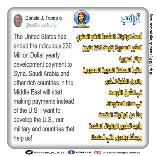 ترامب: واثق الآن أكثر من أي وقت مضى بأن جيش الولايات المتحدة سيضيف مجدا تلو الآخر في الأيام القادمة http://25-janaer.blogspot.com/ مدونة افتكاسات - هشام حسنى ...
