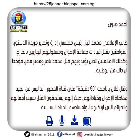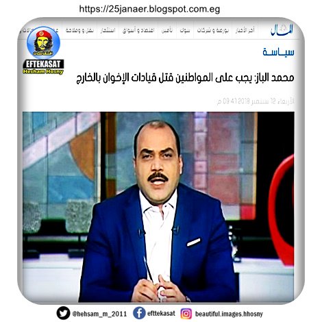 طالب الإعلامى محمد الباز، رئيس مجلسي إدارة وتحرير جريدة الدستور، المواطنين بقتل قيادات جماعة الإخوان ومسئوليهم الهاربين بالخارج، وكذلك الإعلاميين الذين يؤيدونهم مثل محمد ناصر ومعتز مطر، مؤكدا أن ذلك من الوطنية.