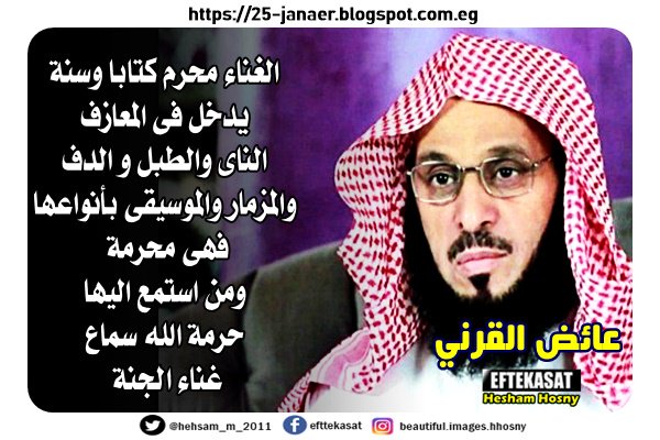 فتوى القرنى فى الغناء : الغناء محرم كتابا وسنة يدخل فى المعازف الناى والطبل و الدف والمزمار والموسيقى بأنواعها فهى محرمة ومن استمع اليها حرمة الله سماع غناء الجنة
