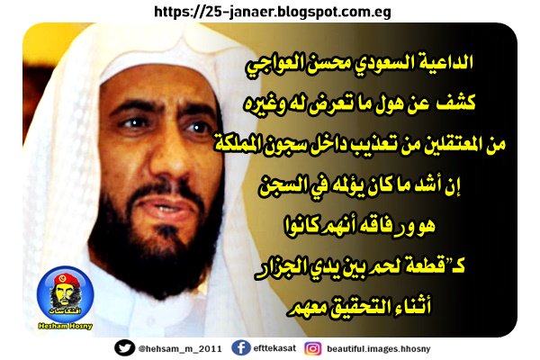 الداعية السعودي محسن العواجي كشف عن هول ما تعرض له وغيره من المعتقلين من تعذيب داخل سجون المملكة إن أشد ما كان يؤلمه في السجن هو ورفاقه أنهم كانوا كـ"قطعة لحم بين يدي الجزار أثناء التحقيق معهم
