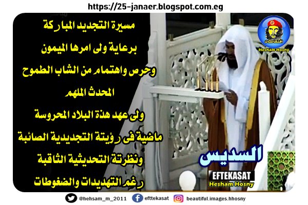 جمال_خاشقجي السديس في خطبة الجمعة عن محمد بن سلمان اليوم مسيرة التجديد المباركة برعاية ولى امرها الميمون وحرص واهتمام من الشاب الطموح المحدث الملهم ولى عهد هذة البلاد المحروسة ماضية فى رؤيتة التجديدية الصائبة ونظرتة التحديثية الثاقبة رغم التهديدات والضغوطات