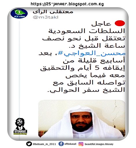 السلطات السعودية تعتقل قبل نحو نصف ساعة الشيخ د. #محسن_العواجي، بعد أسابيع قليلة من إيقافه 5 أيام والتحقيق معه فيما يخص تواصله السابق مع الشيخ سفر الحوالي.