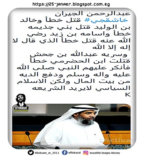 بررلى برر تخيل حرارتك -= عبدالرحمن الجيران #خاشقجي قتل خطأ وخالد بن الوليد قتل بني جذيمه خطأ واسامه بن زيد رضي الله عنه قتل خطأ وسريه عبدالله بن جحش قتلت ابن الحضرمي خطأ فأنكر عليهم النبي صلى الله عليه واله وسلم ودفع الديه من بيت المال ولكن الاسلام السياسي لايريد الشريعه