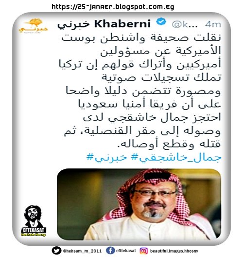 نقلت صحيفة واشنطن بوست الأميركية عن مسؤولين أميركيين وأتراك قولهم إن تركيا تملك تسجيلات صوتية ومصورة تتضمن دليلا واضحا على أن فريقا أمنيا سعوديا احتجز جمال خاشقجي لدى وصوله إلى مقر القنصلية، ثم قتله وقطع أوصاله. #جمال_خاشجقي