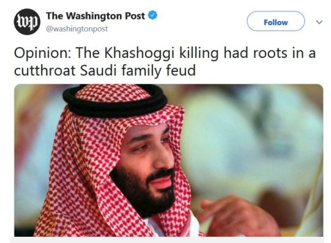 كشفت صحيفة "واشنطن بوست" الأمريكية عن صلة وثيقة بين الإغتيال الوحشي الذي تعرض له الصحفي السعودي جمال خاشقجي داخل قنصلية بلاده باسطنبول اكتوبر الماضي وبين صراع السلطة والثروة داخل العائلة الحاكمة السعودية، وقالت الصحفية إن وراء القتل الوحشي لخاشقجي يكمن صراع السلطة داخل عائلة آل سعود الذي ساعد في تغذية جنون العظمة والتهور لدى ولي العهد السعودي محمد بن سلمان ما ادى في نهاية المطاف إلى مقتل خاشقجي وتقطيع جثته.
