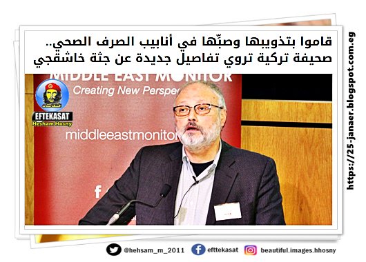 صحيفة «صباح» التركية، أن قتلة الصحافي جمال خاشقجي في القنصلية السعودية في إسطنبول، تخلَّصوا من جثته عبر رميها في أنابيب شبكة الصرف الصحي، بعد تذويبها في مادة الحمض.