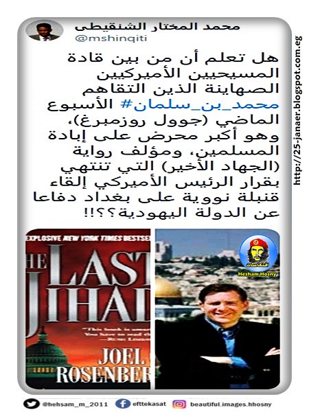 الشنقيطي هل تعلم أن من بين قادة المسيحيين الأميركيين الصهاينة الذين التقاهم #محمد_بن_سلمان الأسبوع الماضي (جوول روزمبرغ)، وهو أكبر محرض على إبادة المسلمين، ومؤلف رواية (الجهاد الأخير) التي تنتهي بقرار الرئيس الأميركي إلقاء قنبلة نووية على بغداد دفاعا عن الدولة اليهودية؟؟!!