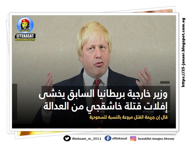 وزير خارجية بريطانيا السابق يخشى إفلات قتلة خاشقجي من العدالة قال بوريس جونسون إن جريمة القتل مروعة بالنسبة للسعودية، وقد تستغلها إيران للانتفاع من تداعياتها