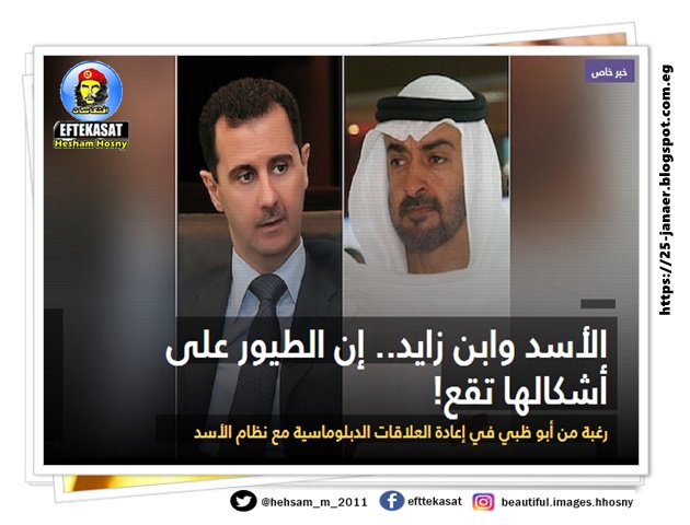الأسد وابن زايد.. إن الطيور على أشكالها تقع! رغبة من أبو ظبي في إعادة العلاقات الدبلوماسية مع نظام الأسد الذي اعقتل وقتل وشرّد الملايين من شعبه.