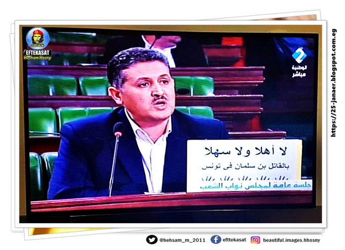 #تونس | النائب "عماد الدائمي" يضع لافتة أثناء كلمته بالبرلمان: لا أهلاً ولا سهلاً بالقاتل بن سلمان في تونس
