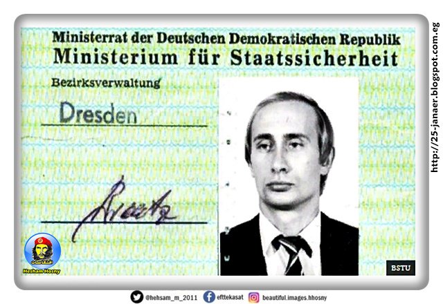 عُثر على بطاقة هوية تجسس الرئيس الروسي فلاديمير بوتين، الخاصة بأمن الدولة في ألمانيا الشرقية (شتازي) واستخدمها بوتين عندما كان يعمل لصالح الاتحاد السوفيتي، محفوظة في أرشيف الشرطة السرية الألمانية في دريسدن.