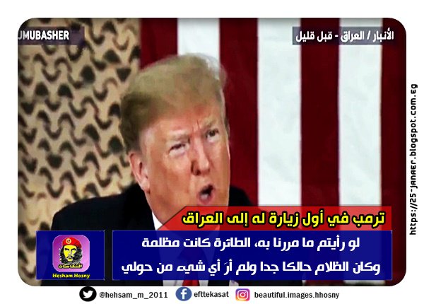 ترمب في أول زيارة له إلى العراق: لو رأيتم ما مررنا به، الطائرة كانت مظلمة وكان الظلام حالكا جدا ولم أرَ أي شيء من حولي