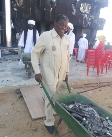أعضاء من حزب المؤتمر الوطني الحاكم في السودان ينظفون رماد الحريق الذي أتي علي كامل دار المؤتمر الوطني بمدينة عطبرة #مدن_السودان_تنتفض