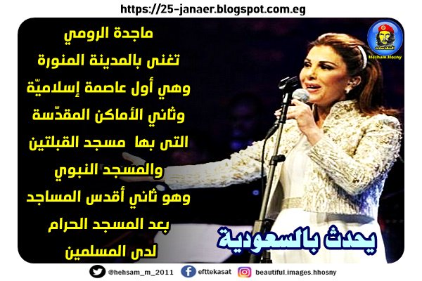 ماجدة الرومي تغنى بالمدينة المنورة وهي أول عاصمة إسلاميّة وثاني الأماكن المقدّسة التى بها مسجد القبلتين والمسجد النبوي وهو ثاني أقدس المساجد بعد المسجد الحرام لدى المسلمين