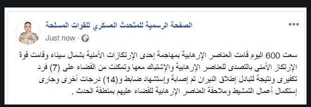 وأعلن المتحدث العسكري، الأسبوع الماضي، أن القوات الجوية نفذت طلعة مركزة لاستهداف بؤرة إرهابية، وبمتابعة نتائج القذف الجوى أسفر عن القضاء على عدد من العناصر الإرهابية بينهم اثنين من القيادات الرئيسية للتنظيم الإرهابي بـشمال سيناء.