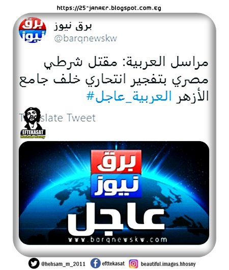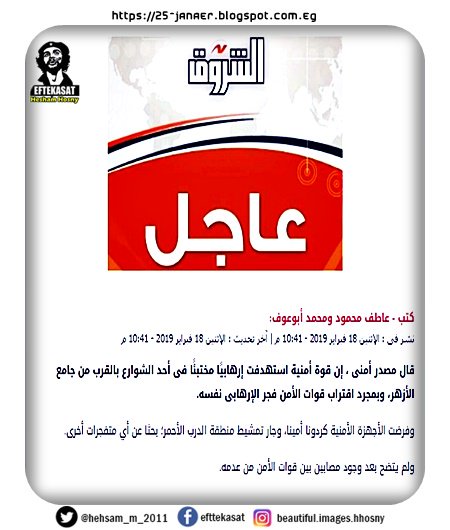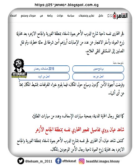 اول صور للارهابى -=- عاجل: انتحاري يفجّر نفسه بمنطقة الجمالية بالقرب من جامع الأزهر، وذلك بعد اشتباه أحد رجال الشرطة فيه وملاحقته بأحد الشوارع الجانبية بمحيط «الأزهر»، بحسب شهود عيان.