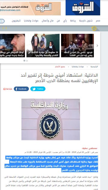 وأضاف الشاهد في تصريح لـ”القاهرة 24″، أن ضباط المباحث شكوا في أحد الأفراد يتجول بالمنطقة، حتي فجر نفسه، ما أسفر عن استشهاد أمين شرطة يدعي “محمود أبو اليزيد” في قسم شرطة الضرب الأحمر