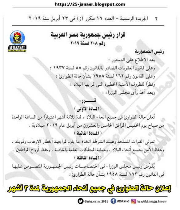 صورة قرار 208/2019 إعلان حالة الطوارئ في جميع أنحاء الجمهورية لمدة 3 أشهر