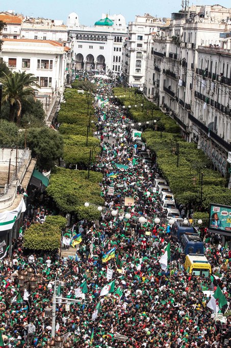 بلغت المظاهرات في الجزائر أوجها بداية الظهيرة مع انتهاء صلاة الجمعة، وردّد المتظاهرون شعارات ترفض تولي المقربين السابقين من الرئيس المستقيل، إدارة المرحلة الانتقالية