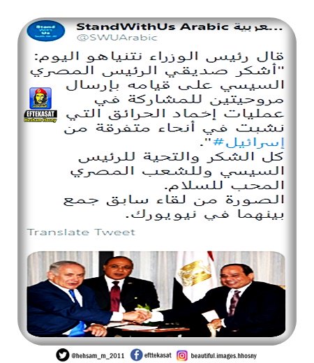 قال رئيس الوزراء نتنياهو اليوم: "أشكر صديقي الرئيس المصري السيسي على قيامه بإرسال مروحيتين للمشاركة في عمليات إخماد الحرائق التي نشبت في أنحاء متفرقة من #إسرائيل". كل الشكر والتحية للرئيس السيسي وللشعب المصري المحب للسلام.