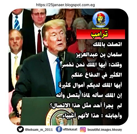 ترامب اتصلت بالملك سلمان بن عبدالعزيز وقلت: أيها الملك نحن نخسر الكثير في الدفاع عنكم أيها الملك لديكم أموال كثيرة إن الملك سأله لماذا يتصل وأنه لم يجرأ أحد مثل هذا الاتصال؟ وأجابته : هذا لأنهم أغبياء