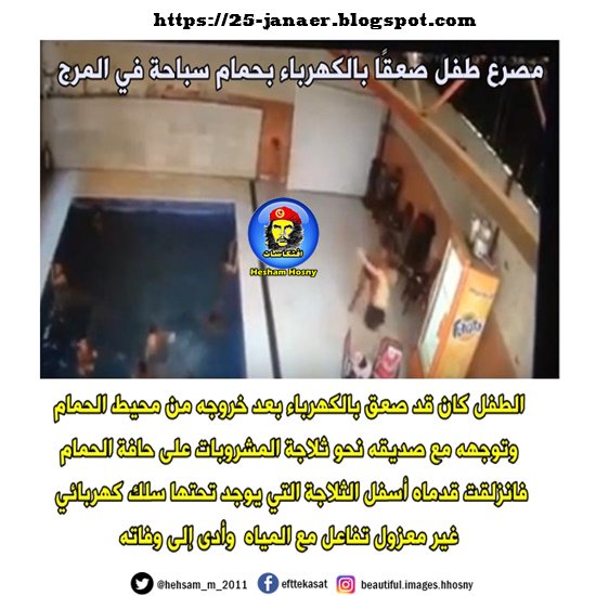الطفل كان قد صعق بالكهرباء بعد خروجه من محيط الحمام وتوجهه مع صديقه نحو ثلاجة المشروبات على حافة الحمام فانزلقت قدماه أسفل الثلاجة التي يوجد تحتها سلك كهربائي غير معزول تفاعل مع المياه وأدى إلى وفاته