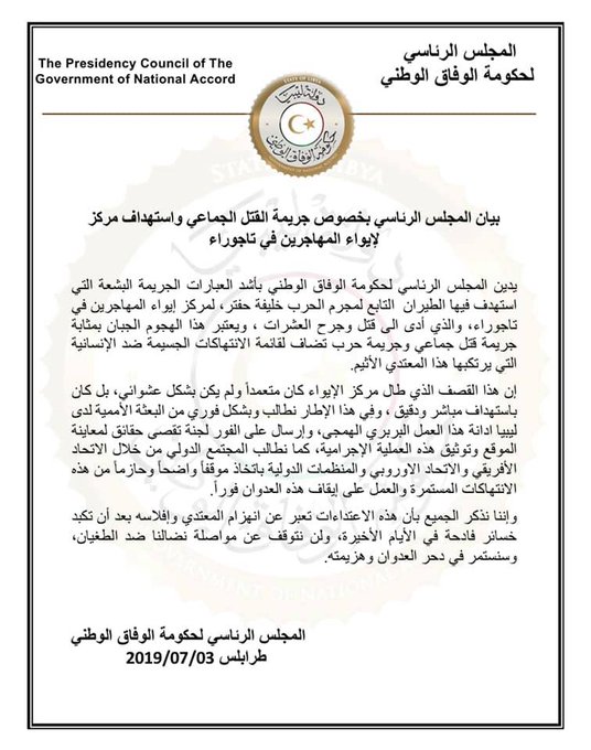 ليبيا بيان المجلس الرئاسي بخصوص جريمة القتل الجماعي واستهداف مركز لإيواء المهاجرين في تاجوراء