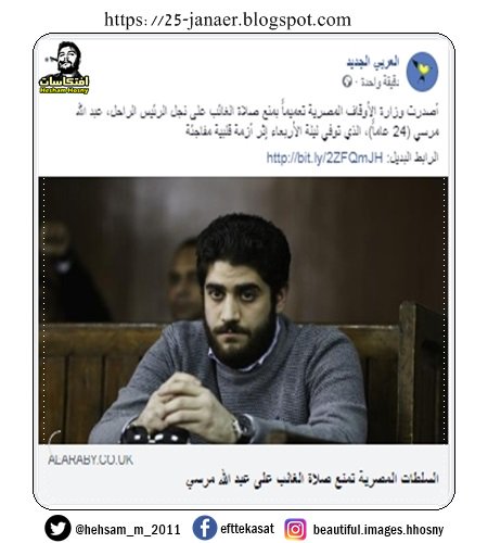 السلطات المصرية تمنع صلاة الغائب على عبد الله مرسي أصدرت وزارة الأوقاف المصرية تعميماً بمنع صلاة الغائب على نجل الرئيس الراحل، عبد الله مرسي (24 عاماً)، الذي توفي ليلة الأربعاء إثر أزمة قلبية مفاجئة