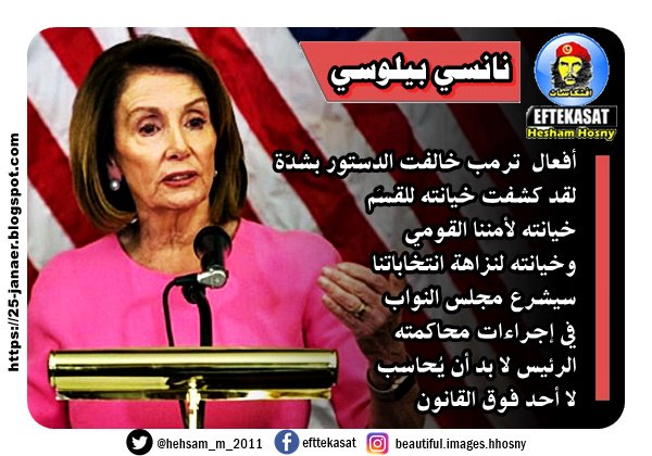 نانسي بيلوسي رئيسة مجلس النوّاب الأميركي -=- أفعال ترمب خالفت الدستور بشدّة لقد كشفت خيانته للقسَم خيانته لأمننا القومي وخيانته لنزاهة انتخاباتنا سيشرع مجلس النواب في إجراءات محاكمته الرئيس لا بد أن يُحاسب لا أحد فوق القانون