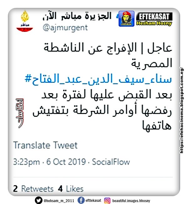 عاجل | الإفراج عن الناشطة المصرية #سناء_سيف_الدين_عبد_الفتاح بعد القبض عليها لفترة بعد رفضها أوامر الشرطة بتفتيش هاتفها