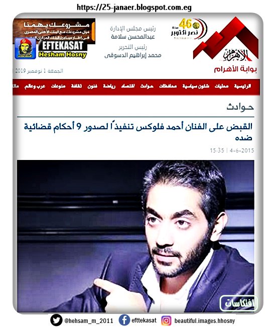 فى 2015 الشهيد على صفحات الجرائد -=- القبض على الفنان أحمد فلوكس تنفيذًا لصدور 9 أحكام قضائية ضده -=- فى قضايا شيكات وتبديد، وأمر اللواء طارق نصر مساعد وزير الداخلية لقطاع أمن الجيزة بإحالته إلى النيابة التى تولت التحقيق.