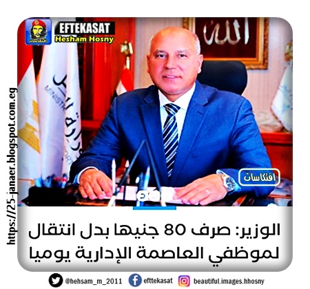 وزير النقل يعلن أن الحكومة ستصرف 80 جنيها يوميا كبدل انتقال لكل موظف، وسيتم نقل 52 ألفا و300 موظفا للعاصمة الجديدة