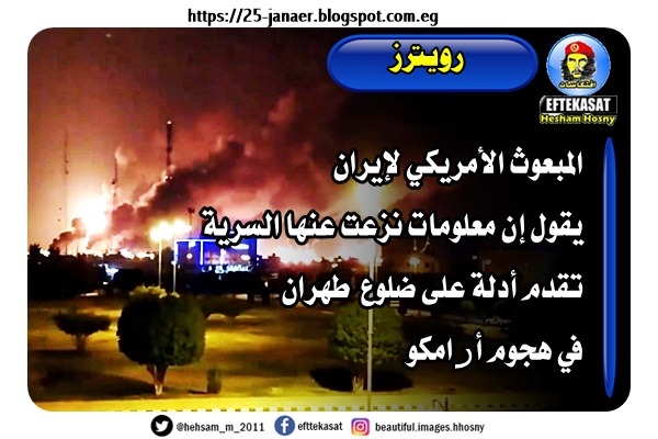 رويترز المبعوث الأمريكي لإيران يقول إن معلومات نزعت عنها السرية تقدم أدلة على ضلوع طهران في هجوم أرامكو