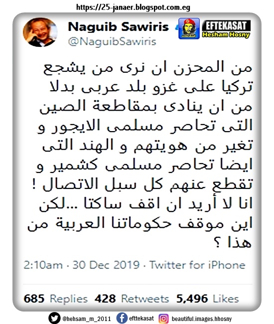 نجيب ساوريس من المحزن ان نرى من يشجع تركيا على غزو بلد عربى بدلا من ان ينادى بمقاطعة الصين