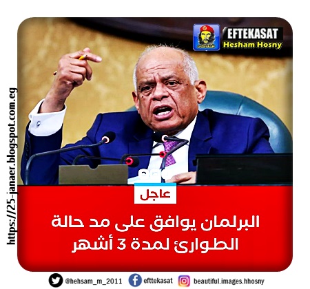 مجلس النواب يوافق بالأغلبية على قرار السيسي بمد حالة الطوارىء لمدة 3 أشهر بدءا من 27 يناير المقبل.