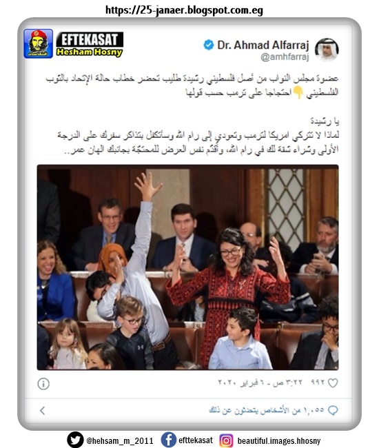 يا رشيدة لماذا لا تتركي امريكا لترمب وتعودي إلى رام الله وسأتكفل بتذاكر سفرك على الدرجة الأولى وشراء شقة لك في رام الله، وأُقدّم نفس العرض للمحتجّة بجانبك الهان عمر..