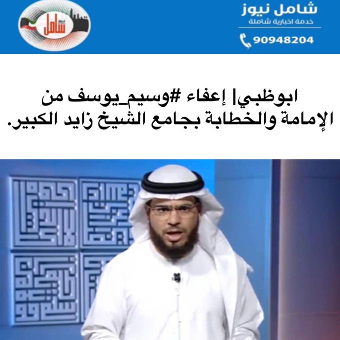 إعفاء #وسيم_يوسف من الإمامة والخطابة بجامع الشيخ زايد الكبير.